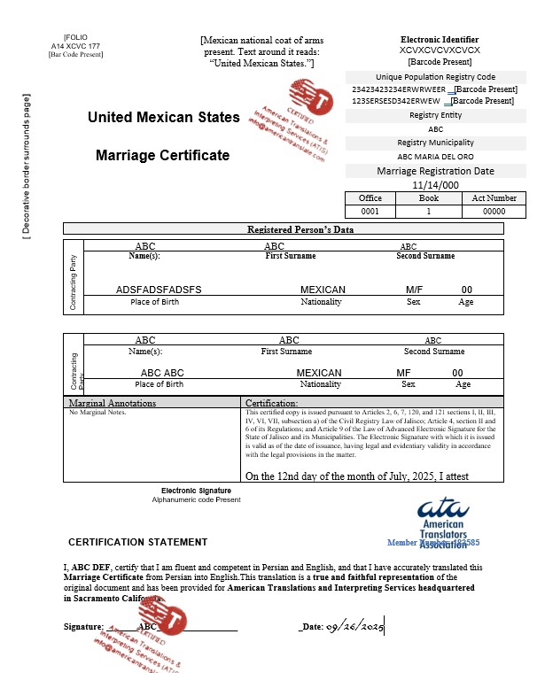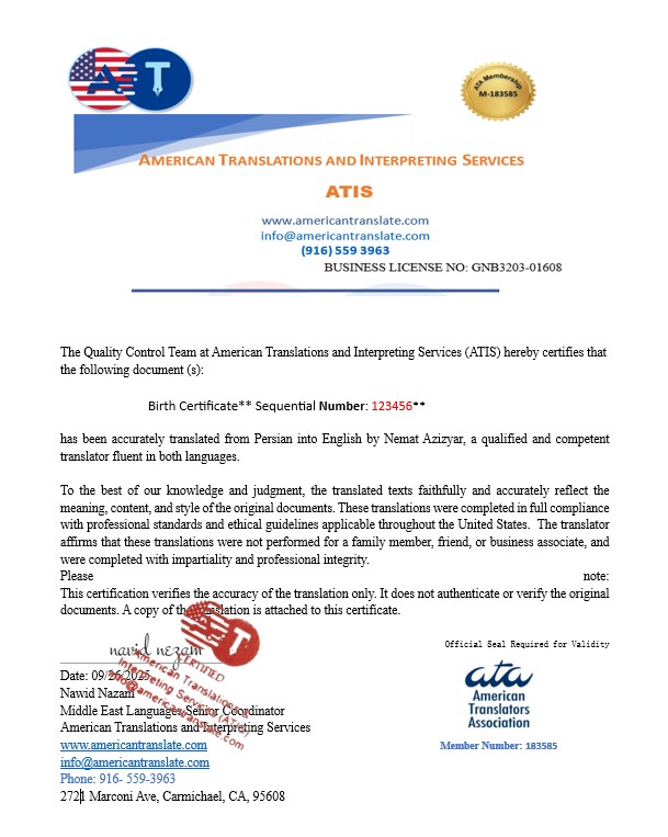 At American Translations and Interpreting Services (ATIS), accuracy comes first. Every client receives a draft translation review opportunity before certification. This ensures that your names, dates, and details are checked and approved by you before we issue the final certified copy.